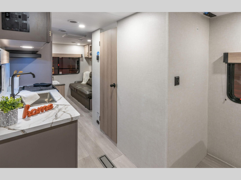A tankless hot water heater will let you enjoy endless hot showers, and the RV Airflow A/C System with an air filter means you'll stay comfortable during the hot summer camping months. Each model also includes an aerodynamic front profile with a sleek smooth metal front, along with a two toned exterior metal that is sure to turn heads at the campground. There are seamless countertops with a stainless steel kitchen sink, residential grade linoleum, wider pocket/passage interior doors, plus many more comforts inside.
