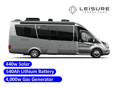 With any Leisure Travel Wonder Class B+ gas motorhome, the construction includes vacuum bonded aluminum framed insulated contoured sidewalls and a domed roof with fiberglass exterior, and a floor with composite exterior on a Ford Transit dual rear wheel chassis. Some highlights include the 16" heavy-duty forged aluminum alloy wheels, the auto high-beam headlamps, and the advance active safety features. The interior offers the SYNC 4 navigation system, curved soft close overhead cabinetry doors with hidden catches, full extension ball bearing soft close drawer tracks, LED aisle lighting and above cabinet hidden accent lights, and tile look vinyl flooring throughout for style and easy care. Optional AWD is available, along with the optional 60th Anniversary Edition decor and exterior color, solar panels for off-grid capability, a battery upgrade, and more!